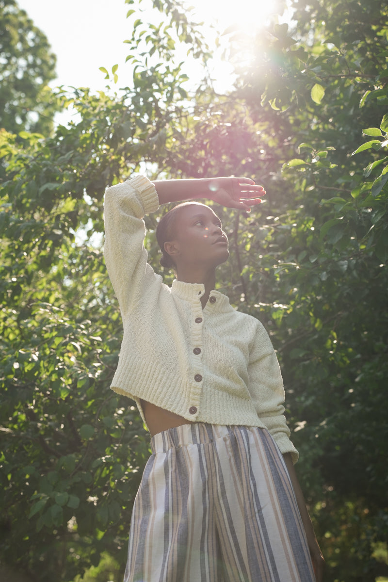 Mazu-Sue Organic Cotton Woven Trousers in Beige Multi Stripe