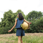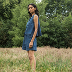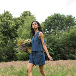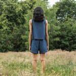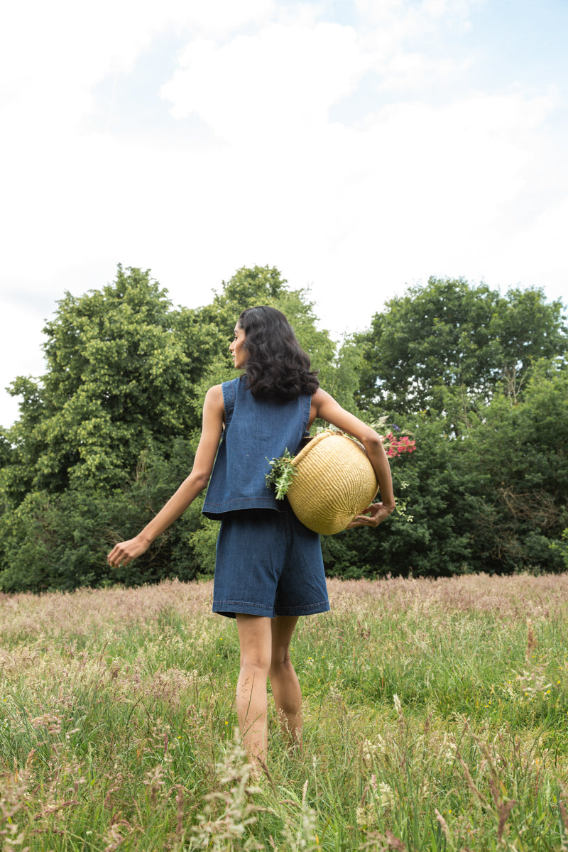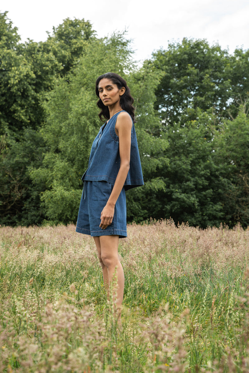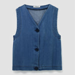 The Jovie-Leigh is a loose-fitting button down vest crafted from 100% organic cotton denim, featuring a V-neck, elasticated detail under the arm and three sustainable corozo buttons.