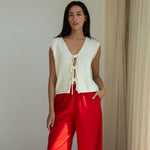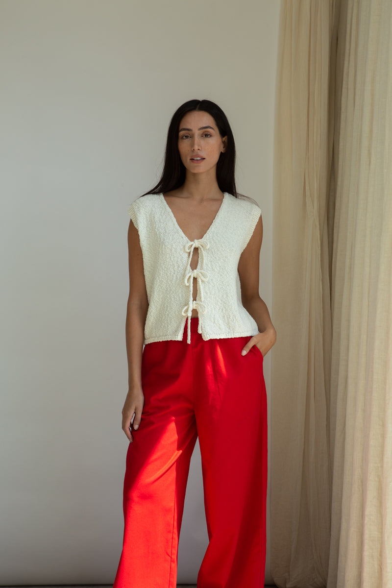 The Florence is an Organic Cotton Linen blend sleeveless, knitted vest top, with a rib detailed hem and pretty tie closures at the front.