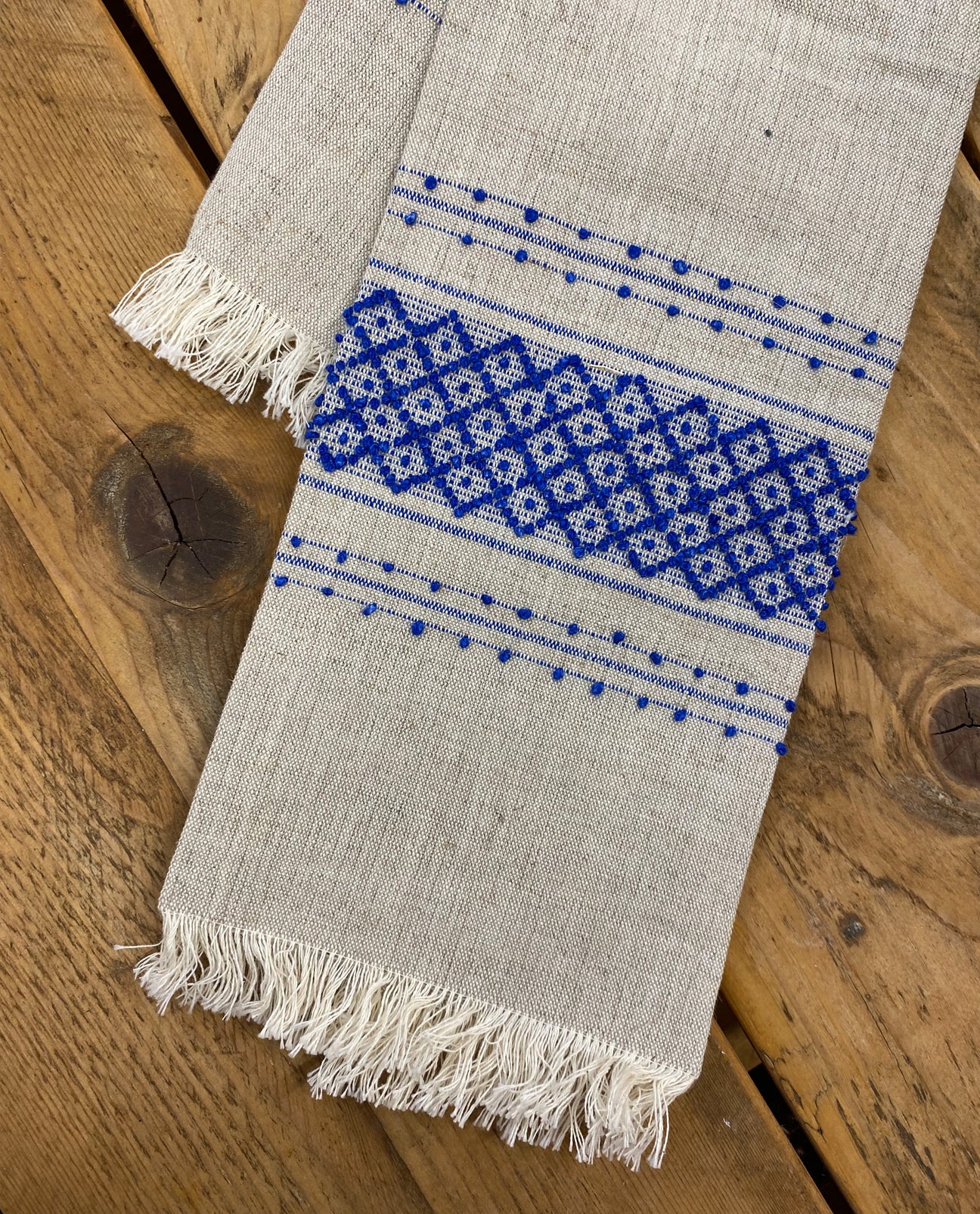 A large linen towel with embroidered blue pattern.