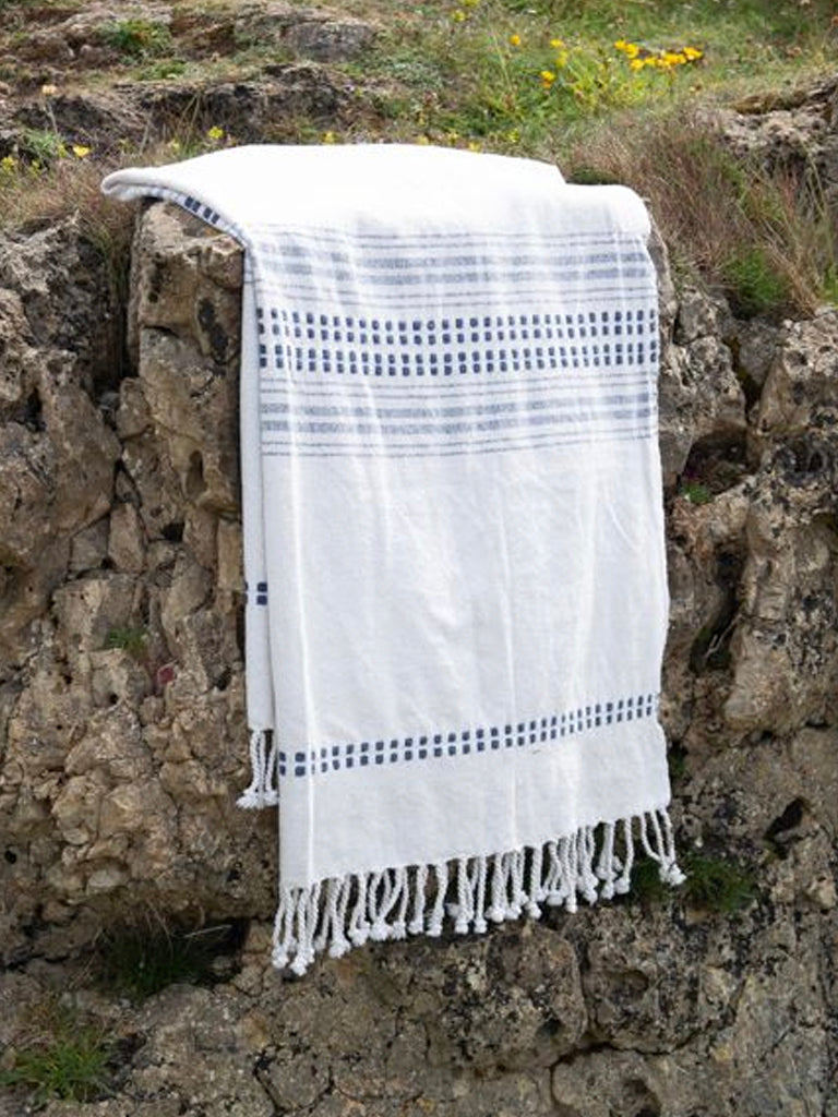 Recycled cotton throw in a cream and blue stripe detail with fringe ends.