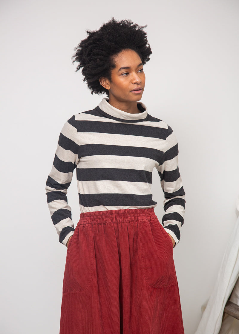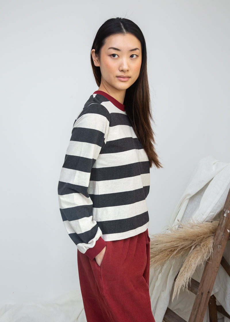 Sierra-Sue Organic Cotton Stripe Jersey Top in Charcoal & Ecru Marl Stripe