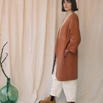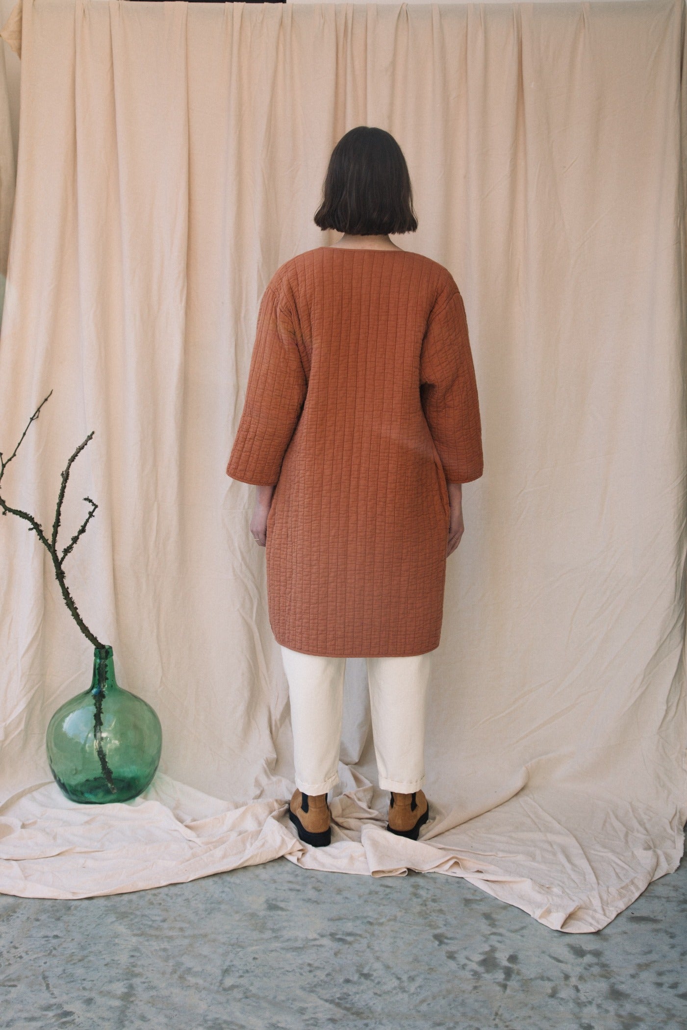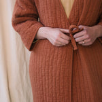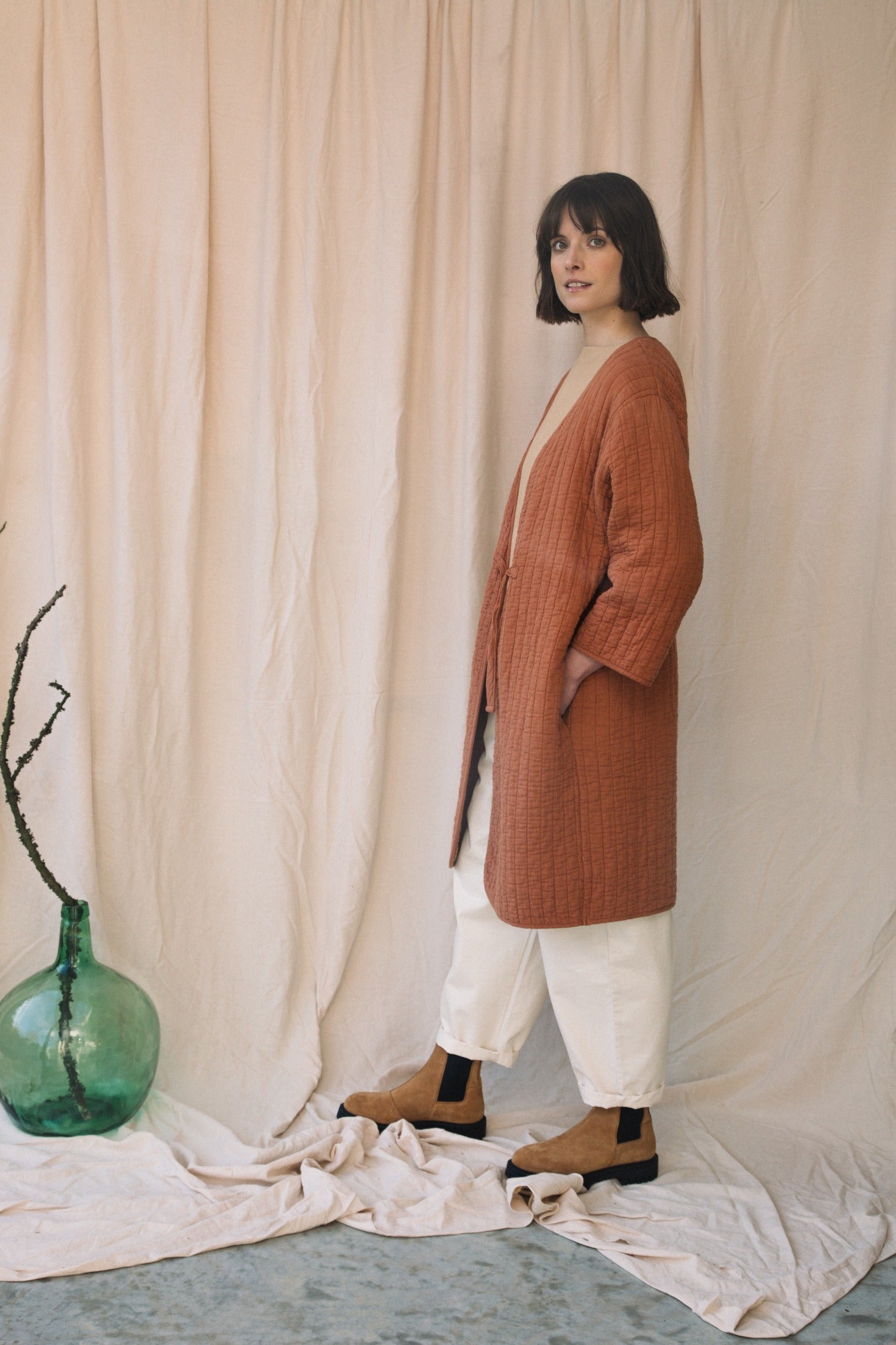 The Akoya is a long line cosy quilted jacket, featuring a cross over tie fastening and pockets on each side.