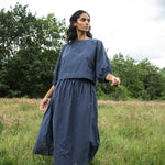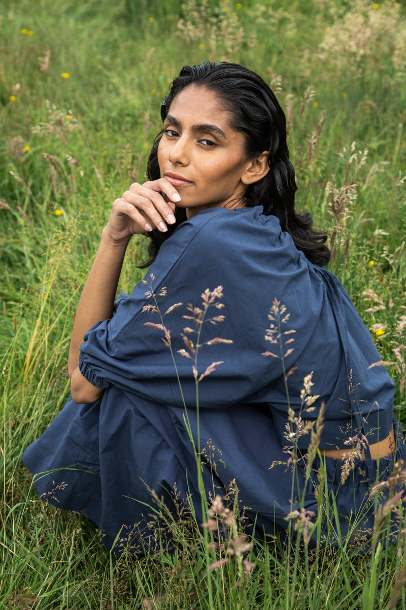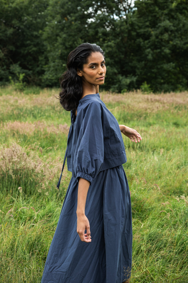 The Dune is a statement top featuring gathered scoop back neckline with tie back, and a balloon sleeve with an elasticated cuff.
