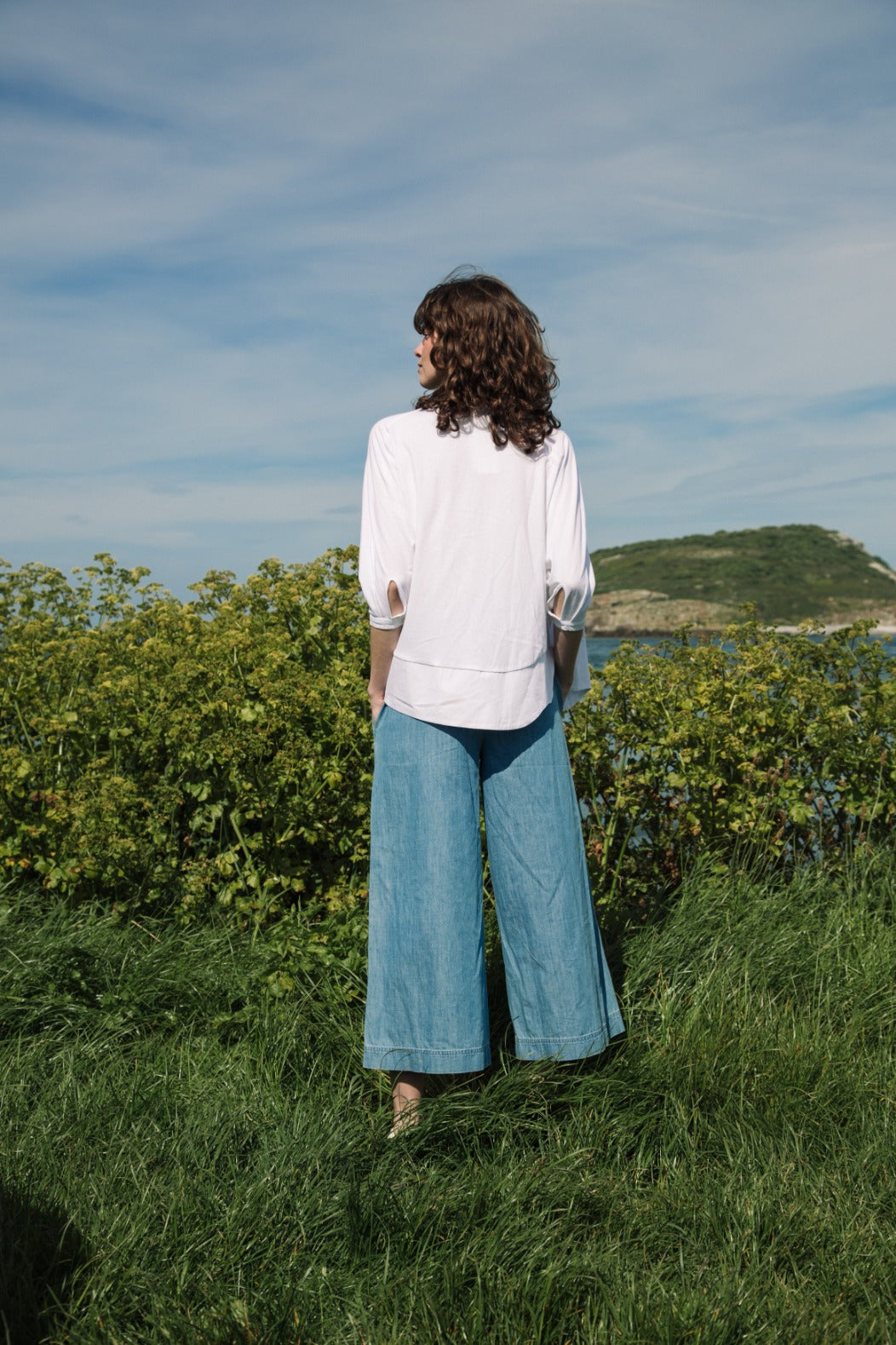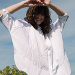 The Everly shirt is an oversized batwing style shirt with a button-down front.