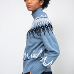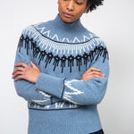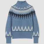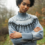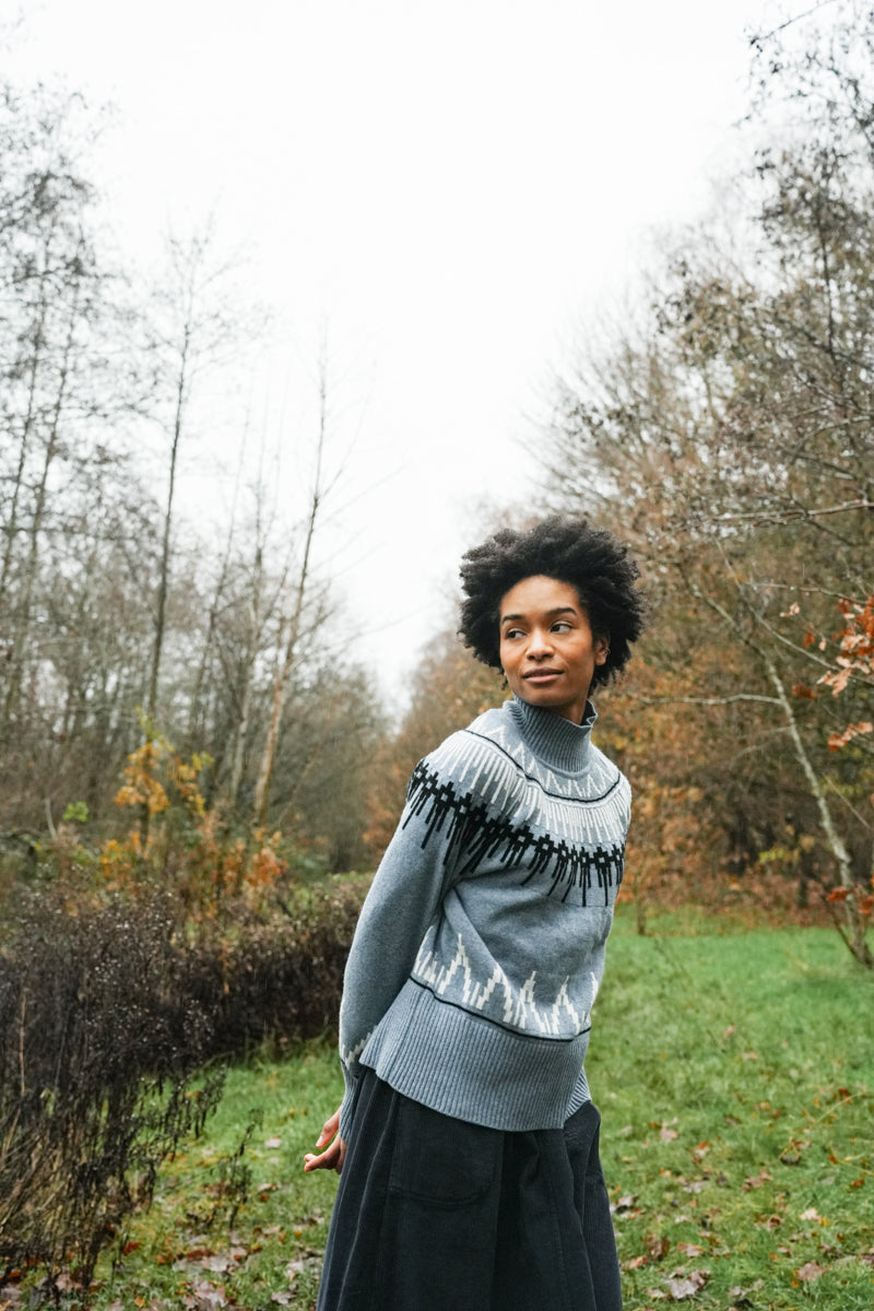The Hawthorne is a funnel neck jumper with a modern Fairisle pattern at the neckline.