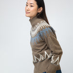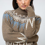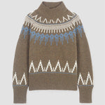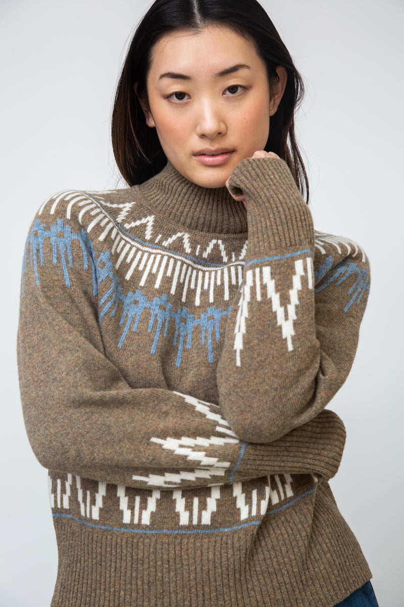 The Hawthorne is a funnel neck jumper with a modern Fairisle pattern on the body and shoulders.