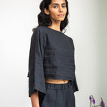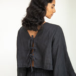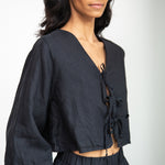 The Kaz-May is a versatile statement blouse that can be worn with the tie details to the front or back. Crafted from crisp linen, it features a cropped hem and 3/4 sleeves.