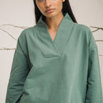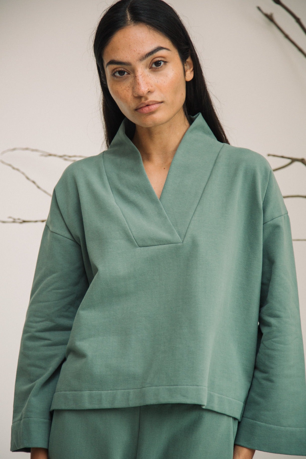 The Kazue is a V-neck sweatshirt style with a deep fold over collar detail and a loose drop shoulder sleeve.
