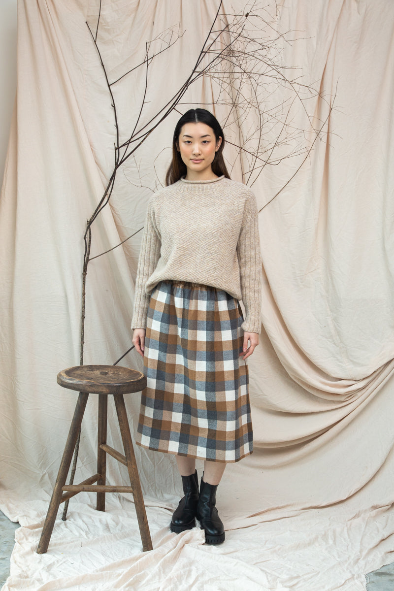 The Shika is new lambswool knit featuring a playful rolled round neck, full rib sleeve, and chevron stitch detail across the body.