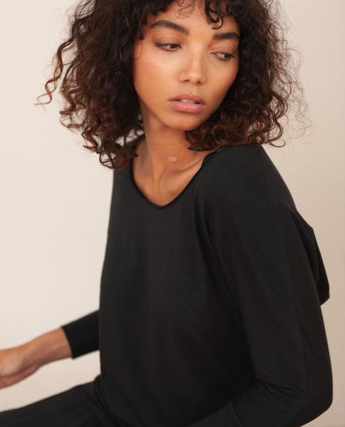 The Miakoda top is super soft and easy to move in whether for a workout or everyday wear. It is fitted at the hip to stay in place during yoga and the batwing sleeve provides easy movement.