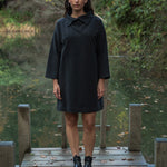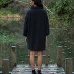 The Ayse is a funnel neck sweater dress with a loose boxy fit and button fastening at the back of the neck,