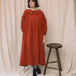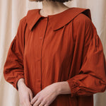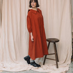 The Aralia is a statement dress for Autumn featuring a large collar, button down placket, voluminous midi length cut and side pockets.