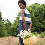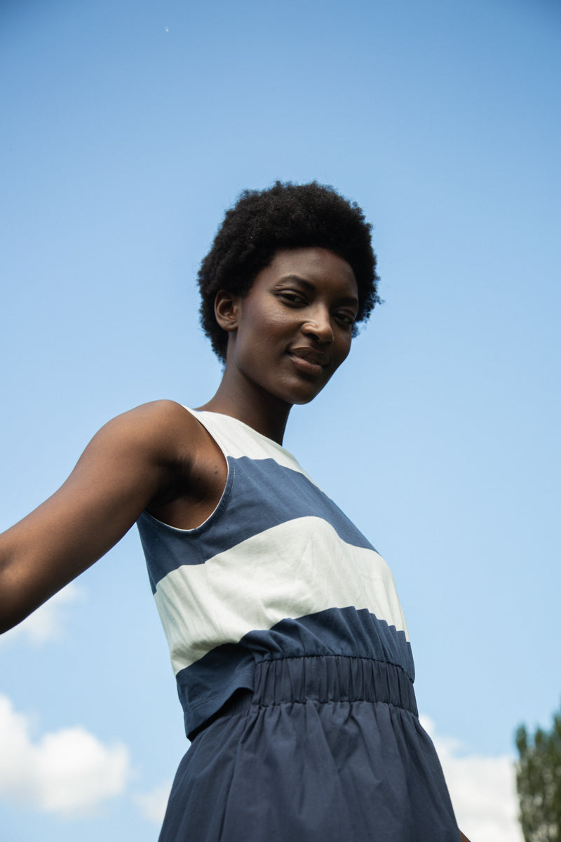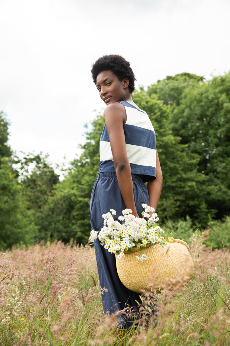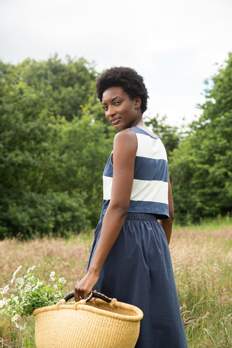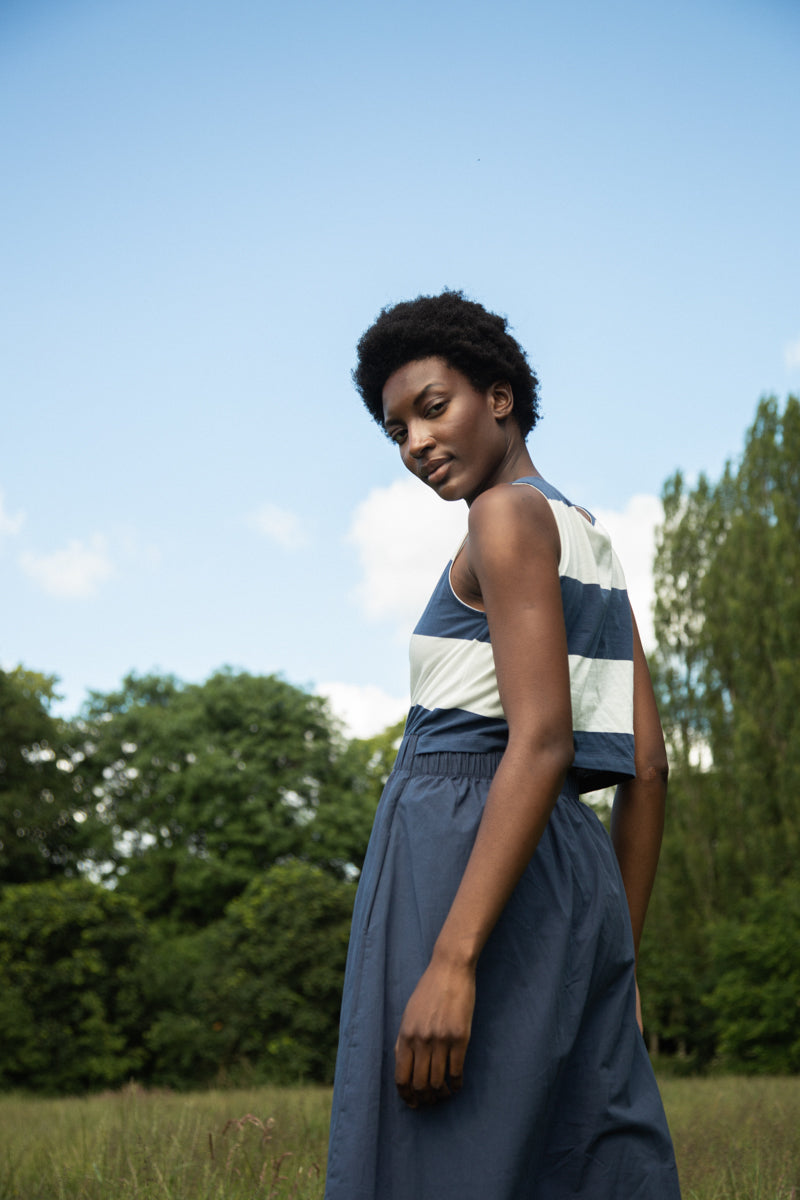 The Cece-Sue is an update to our classic Cece style midi dress, featuring soft striped jersey with an elegant open back detail to the top. The A-line skirt is crafted from smooth poplin and has an elasticated waist & side pockets.