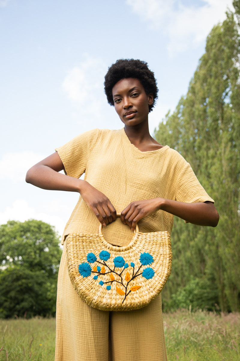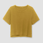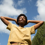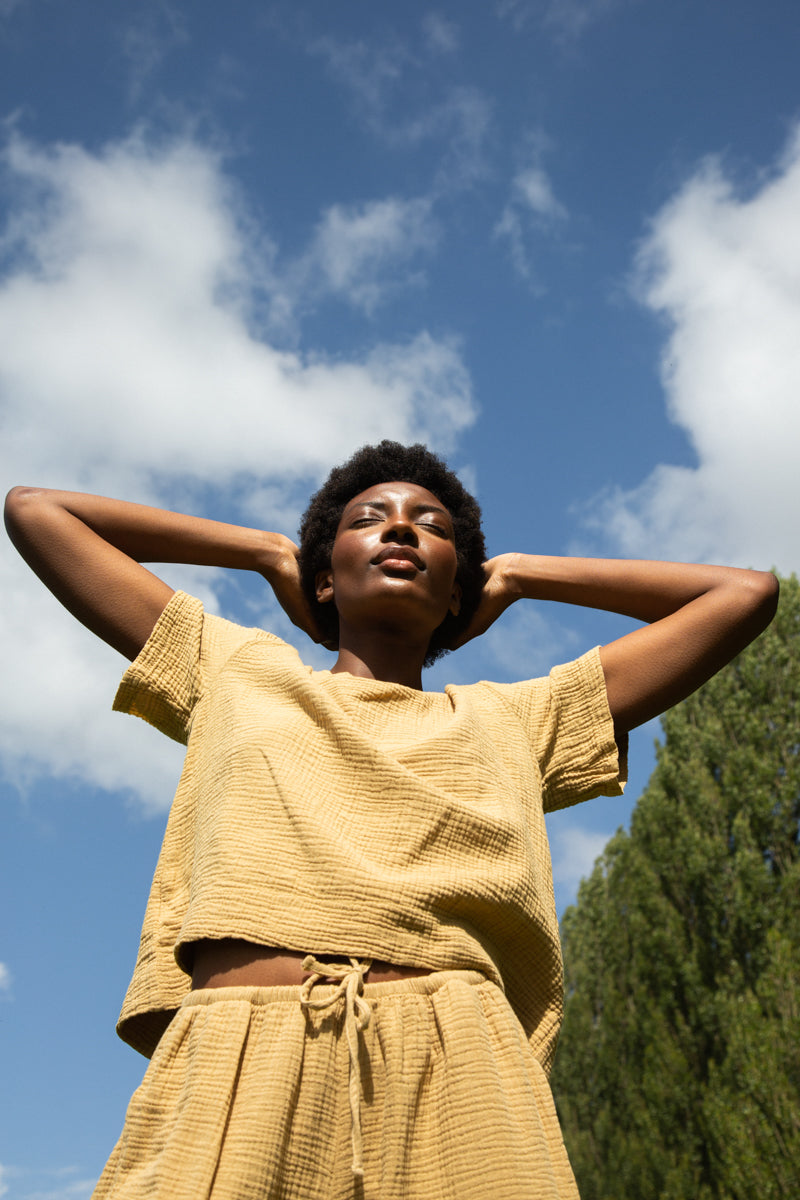 The Jayda top is a relaxed t-shirt that sits slightly cropped with short sleeves, and is crafted from double gauze organic cotton for a soft, textured feel.