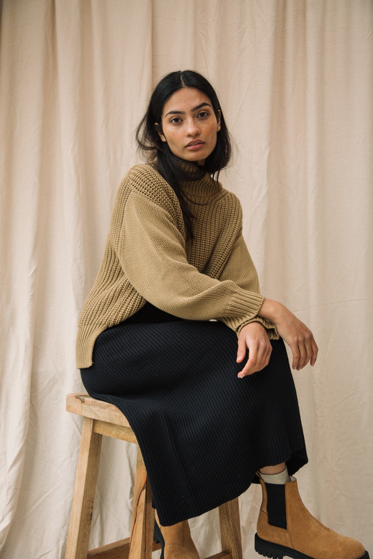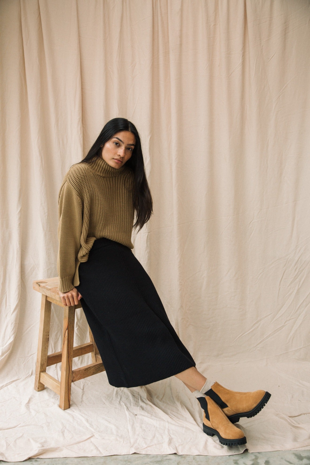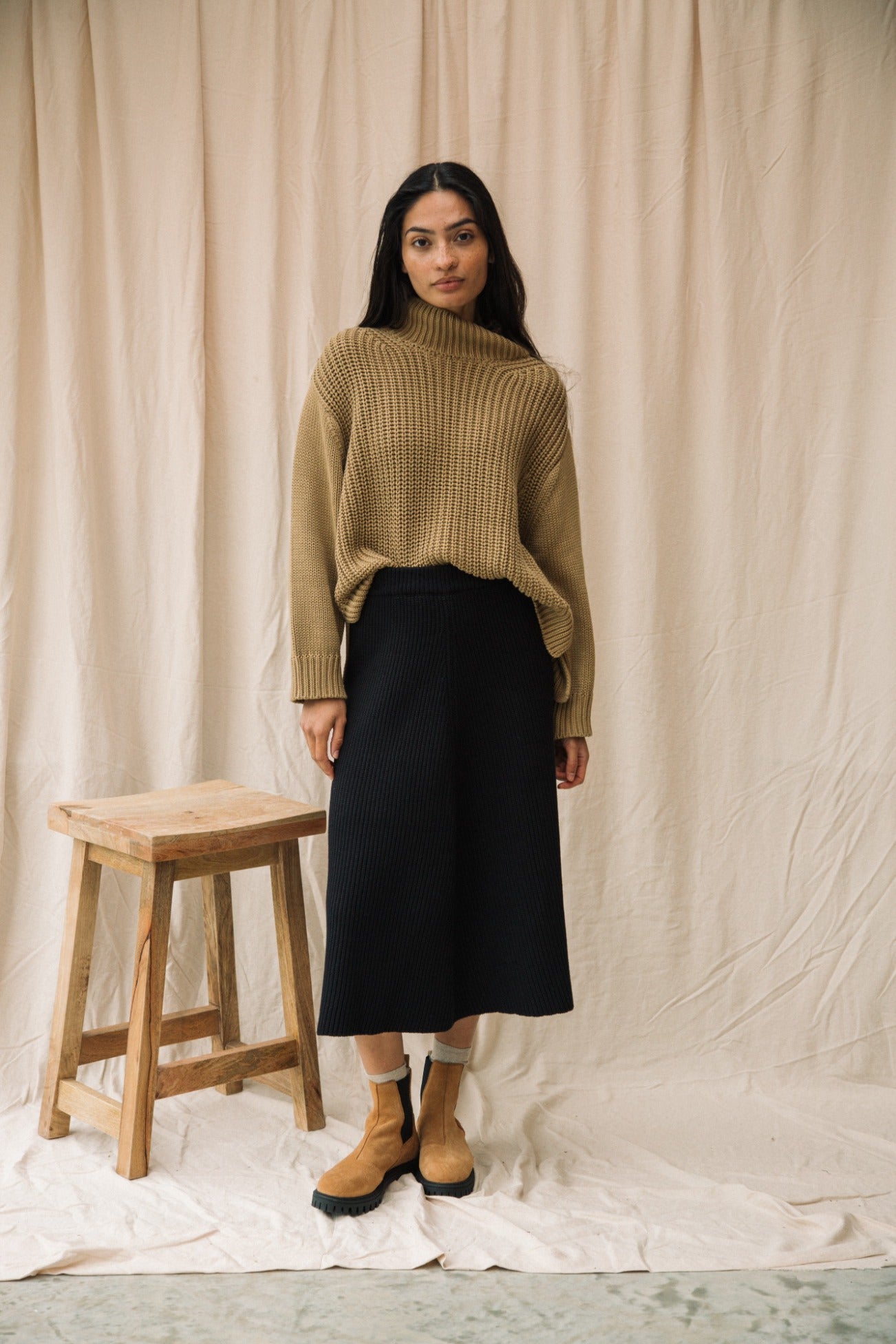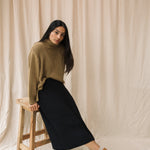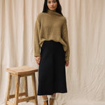 The Mio is a knitted skirt featuring a midi-length, A-line cut, seam detail down the middle and comfortable elasticated waistband.