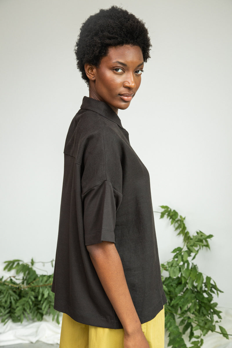The Sejal-May is a boxy style shirt with a button down placket to the front, featuring sustainable corozo buttons. Crafted from a smooth poplin cotton at the front with super-soft jersey cotton on the sleeves and back.