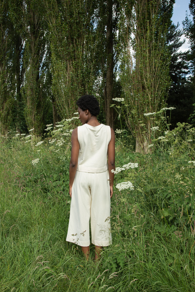 The Taya trousers are a wide leg style with a soft elasticated waistband, slightly cropped leg and two side pockets.