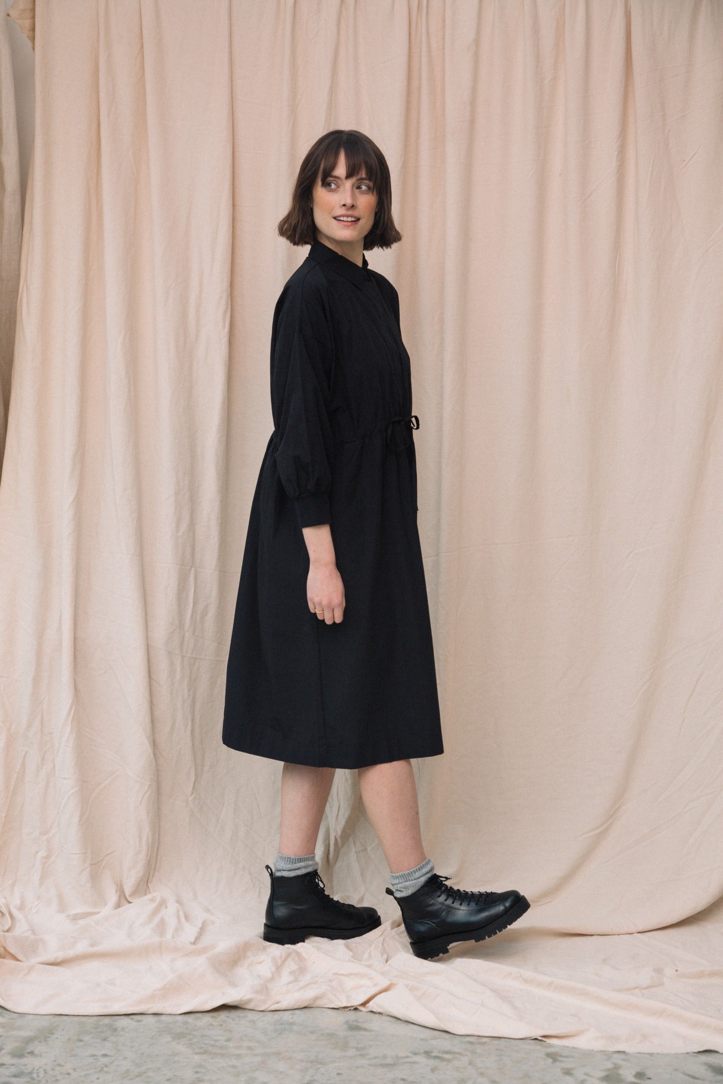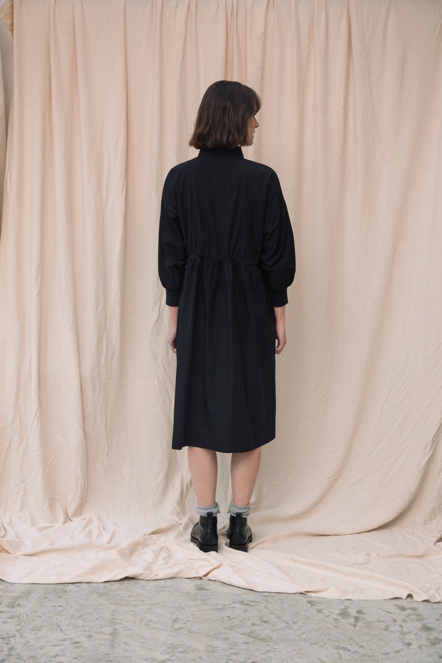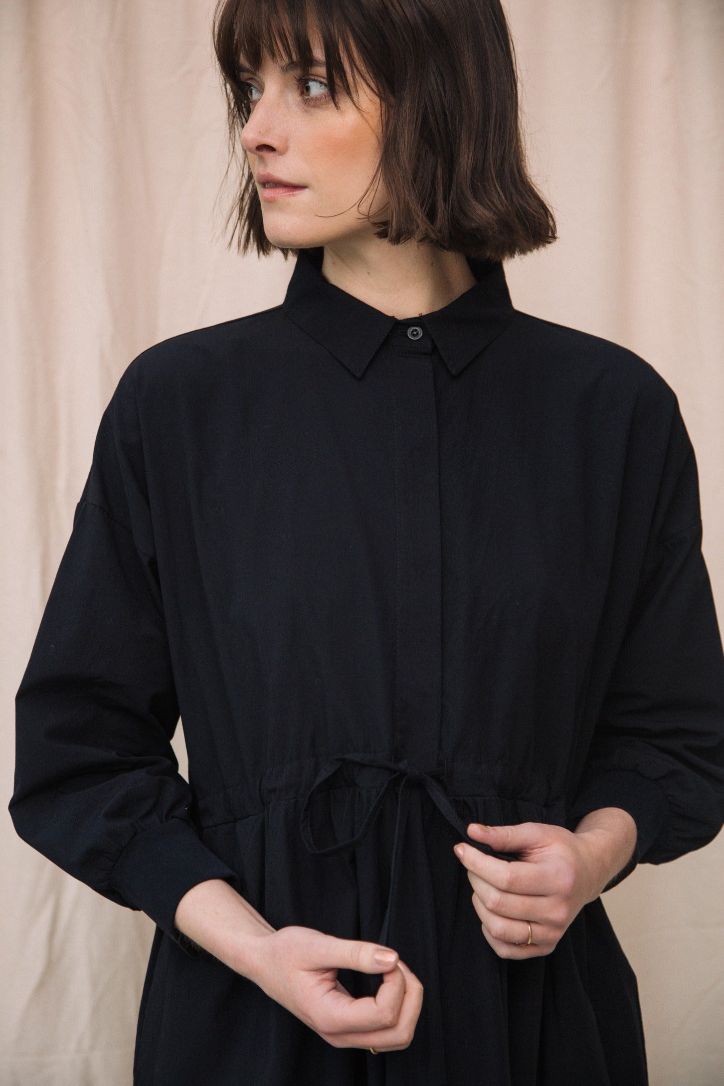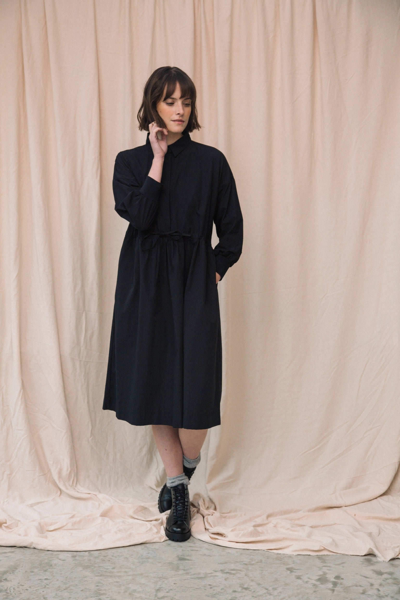 The Umi is a classic shirt dress style with an adjustable drawstring waistband, half placket, midi length and side pockets.