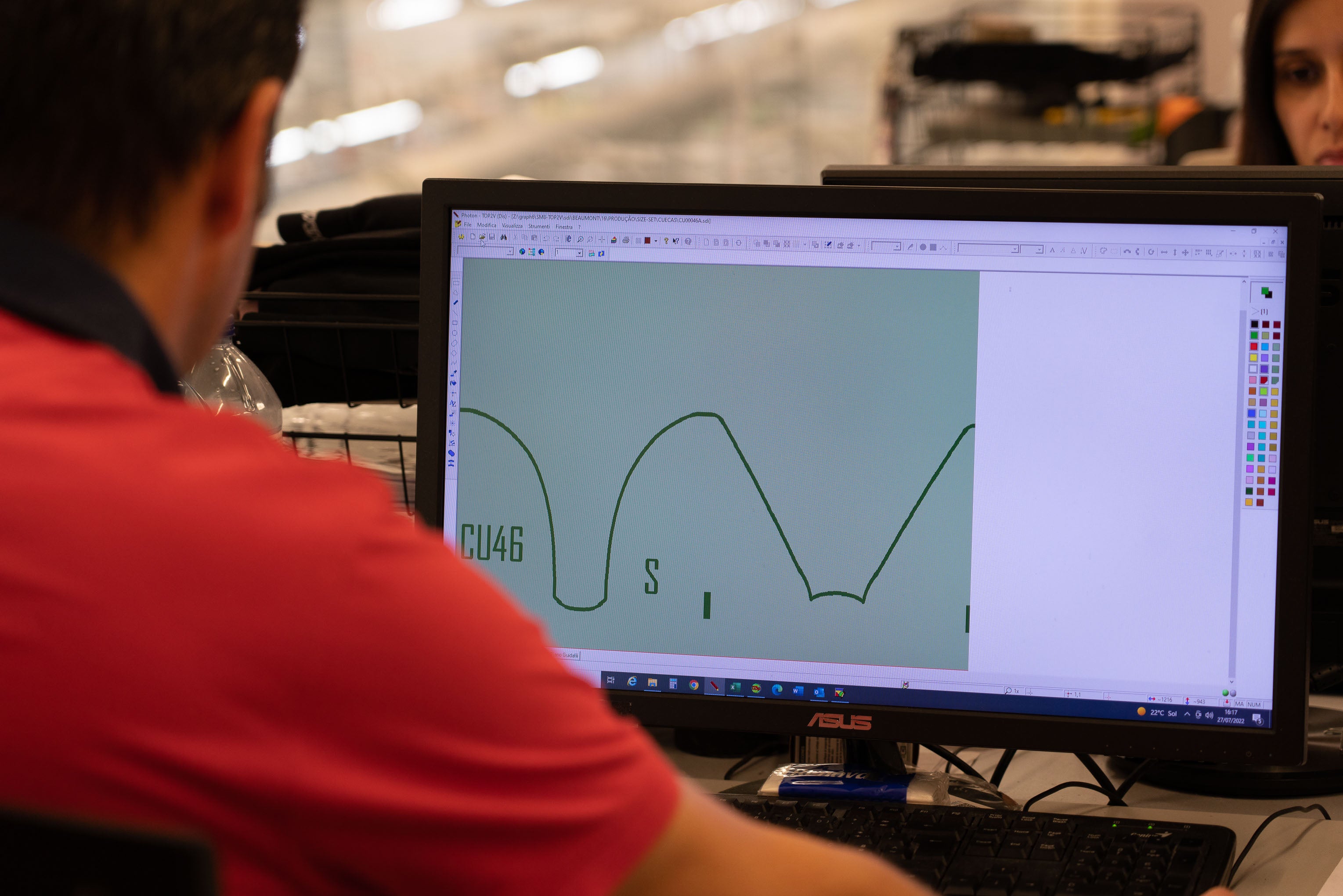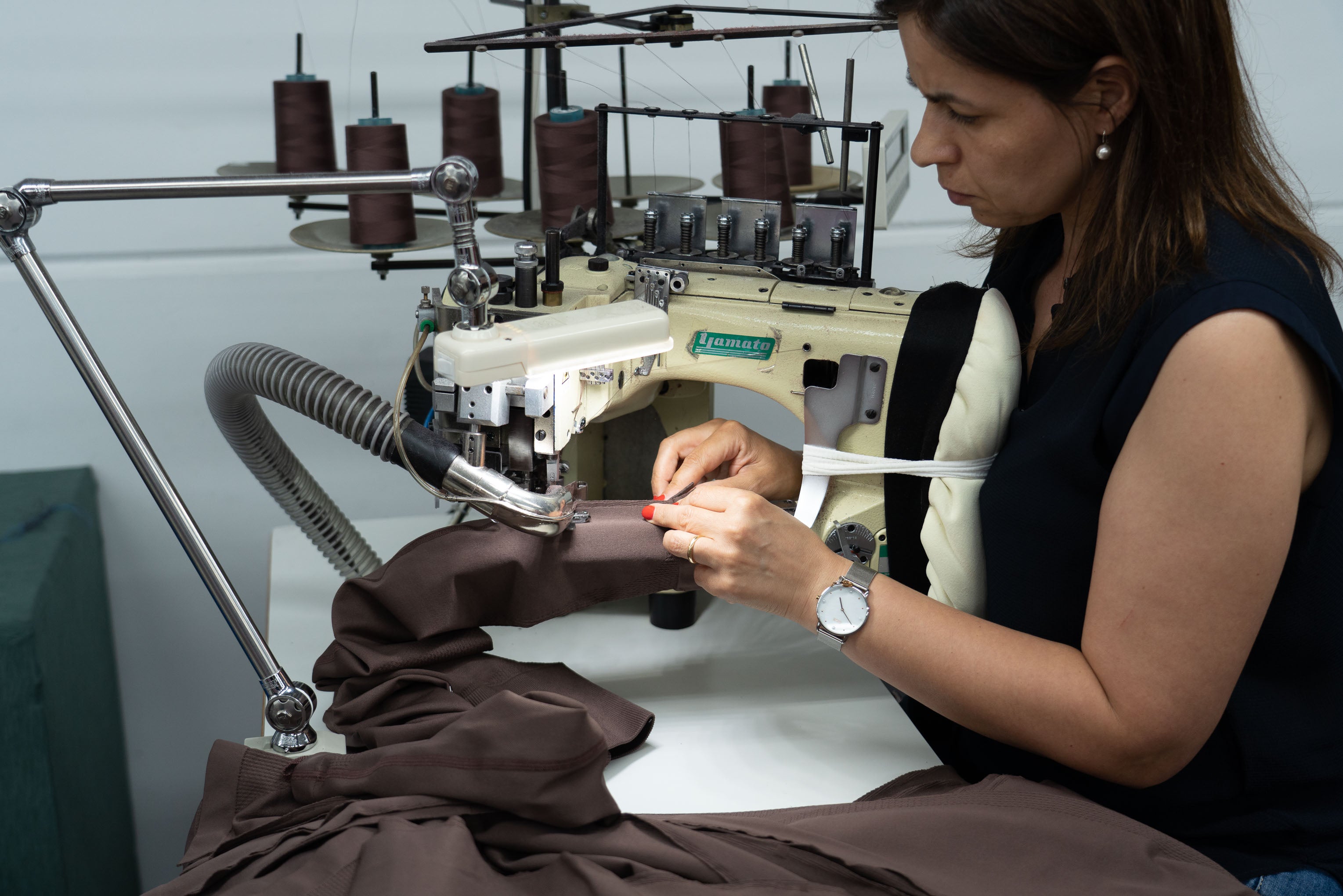 Waistbands and other design elements are finished on smaller more tradtional sewing machines.