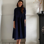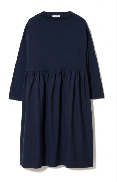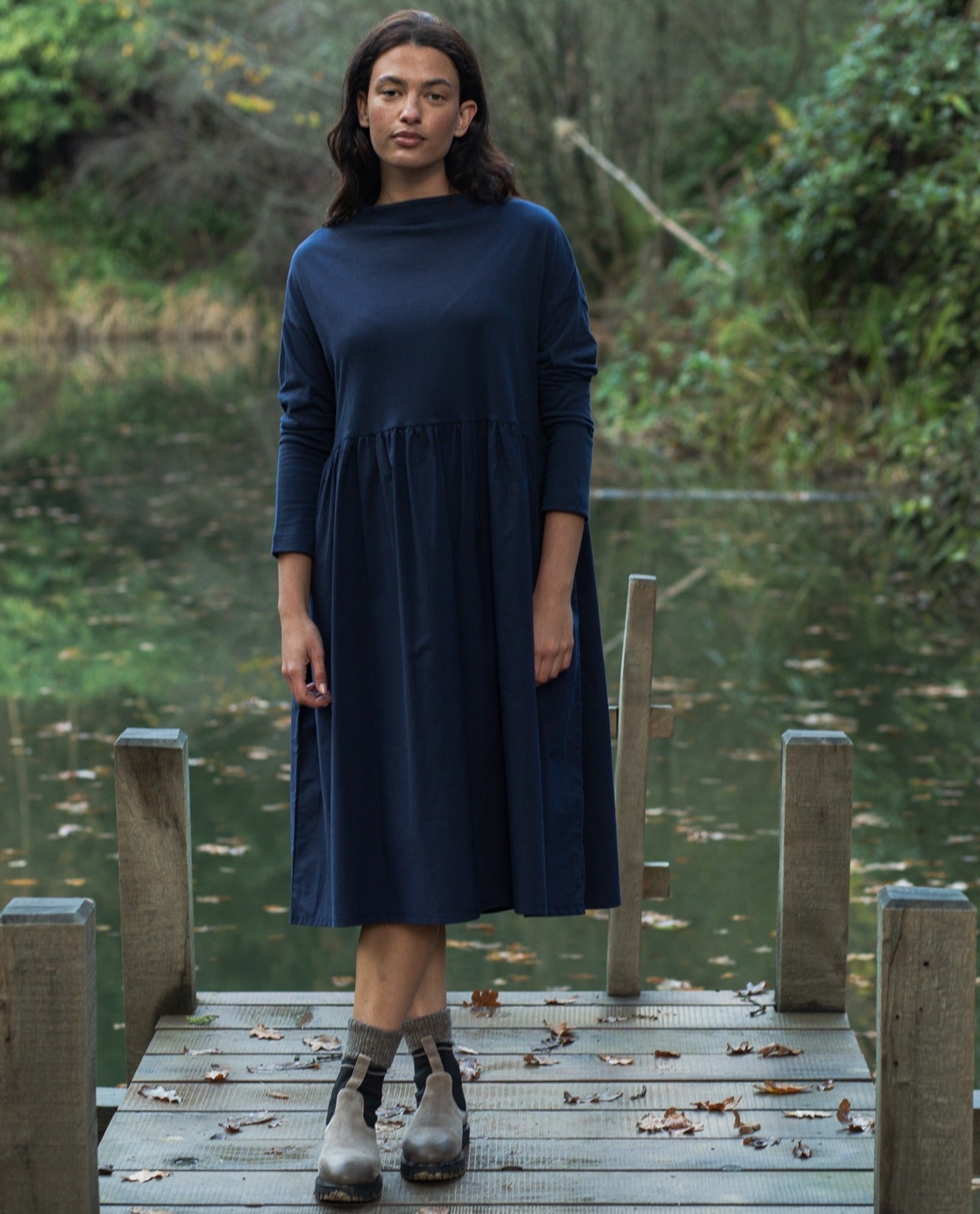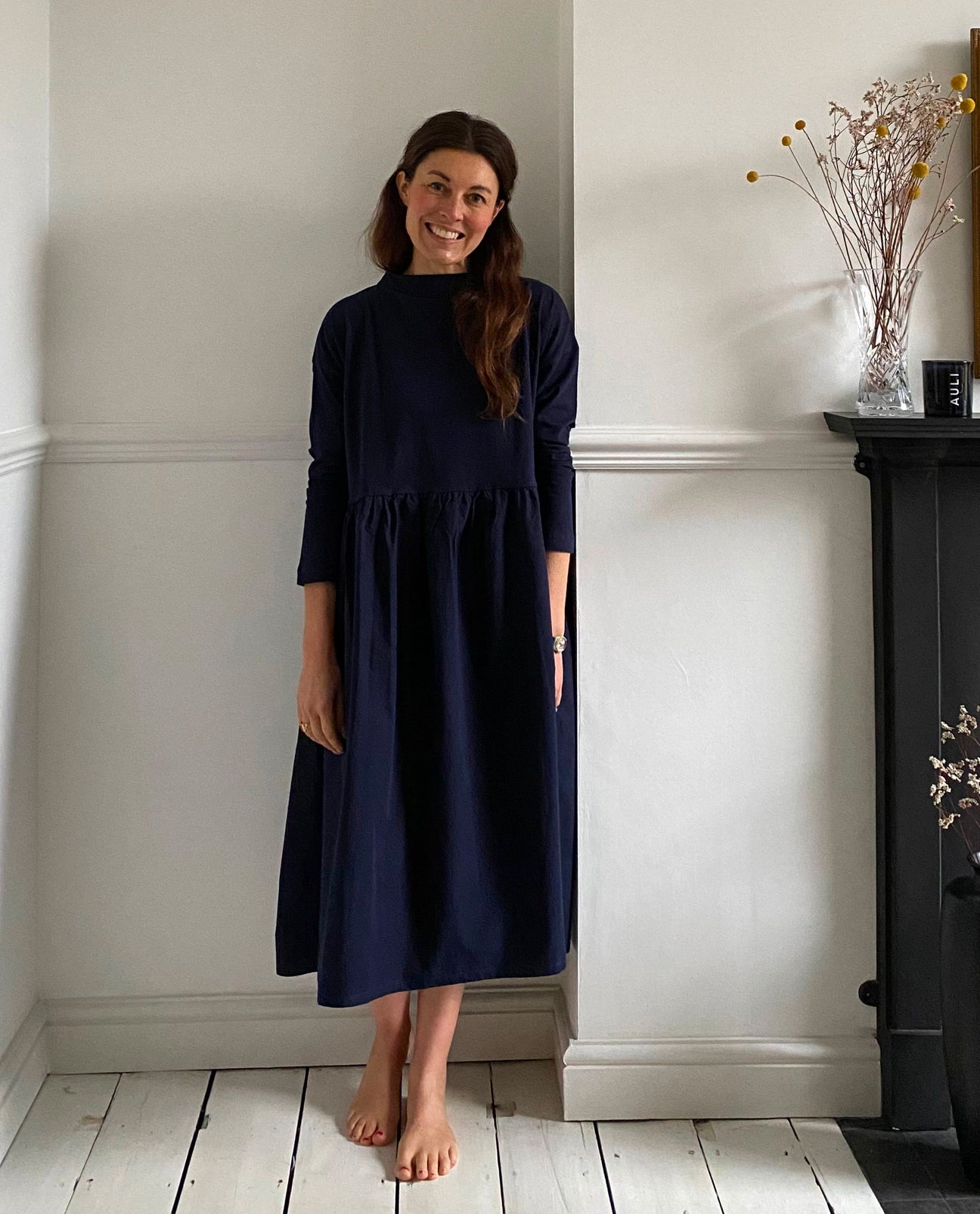 The Bramble is an oversized dress with a high slash neckline, full length sleeve and voluminous poplin skirt.
