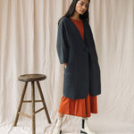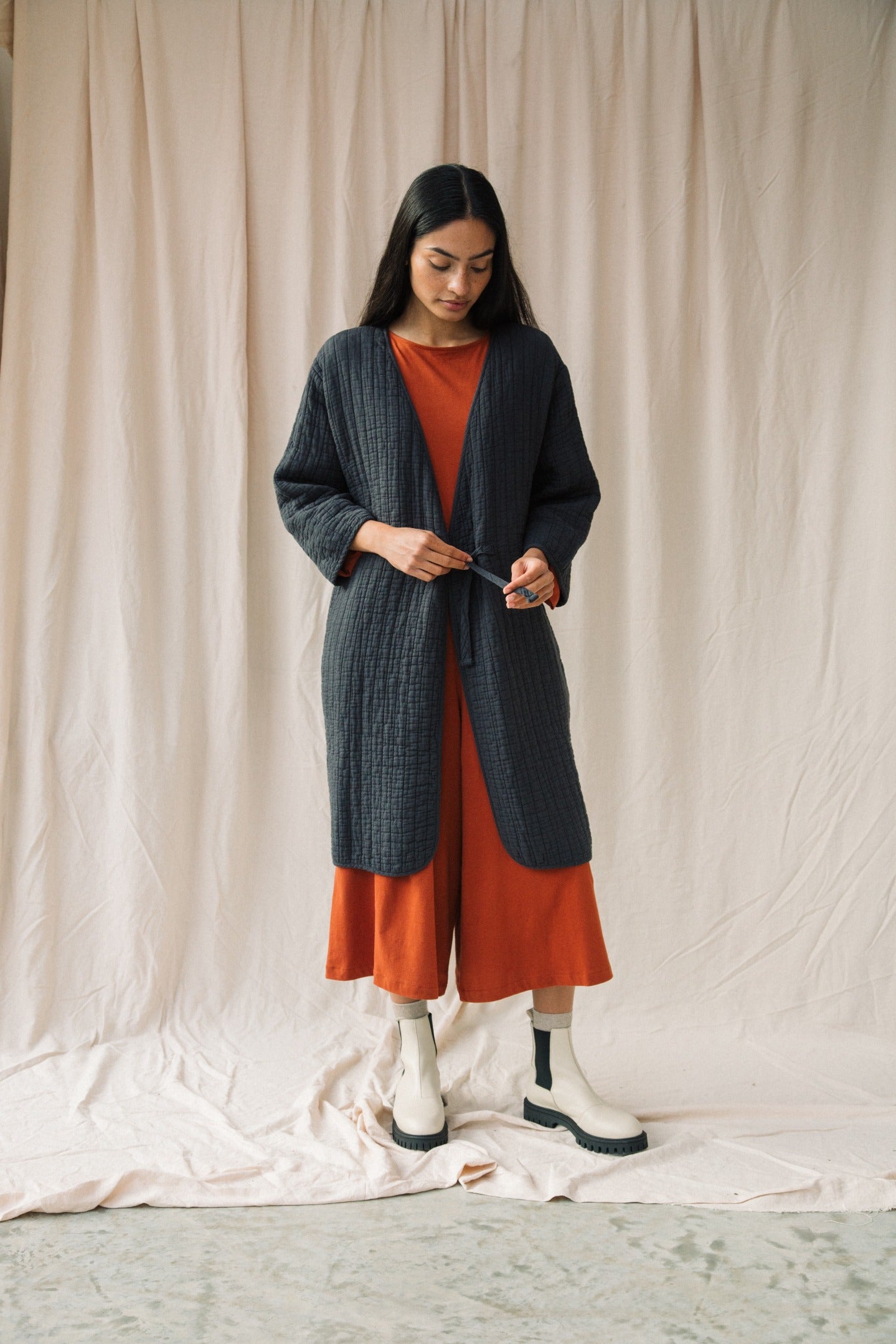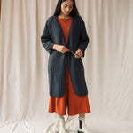 The Akoya is a long line cosy quilted jacket, featuring a cross over tie fastening and pockets on each side.