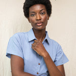 The Bronwyn dress is a structured style with a short sleeve, button down shirt top, featuring an elegant open back detail. The A-line skirt is crafted from smooth poplin and has an elasticated waist & side pockets.