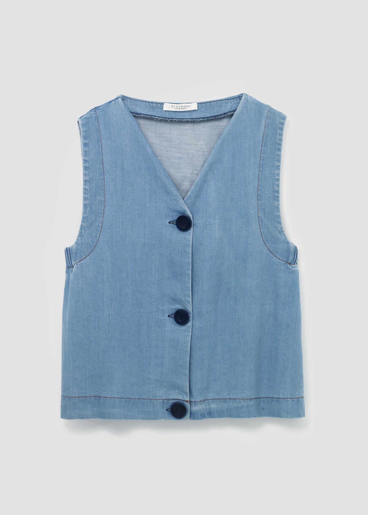 The Jovie-Leigh is a loose-fitting button down vest crafted from 100% organic cotton denim, featuring a V-neck, elasticated detail under the arm and three sustainable corozo buttons.