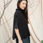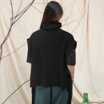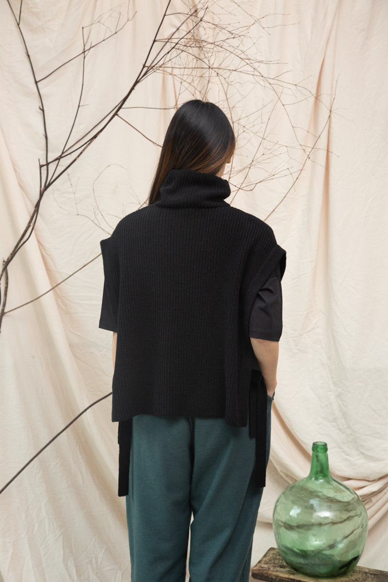 The Kanon is a knitted tabbard vest with a roll neck and adjustable ties at the sides.