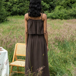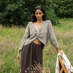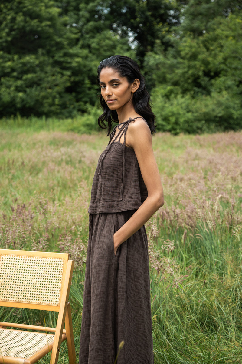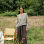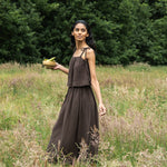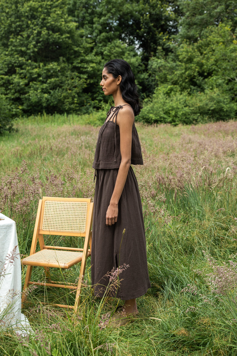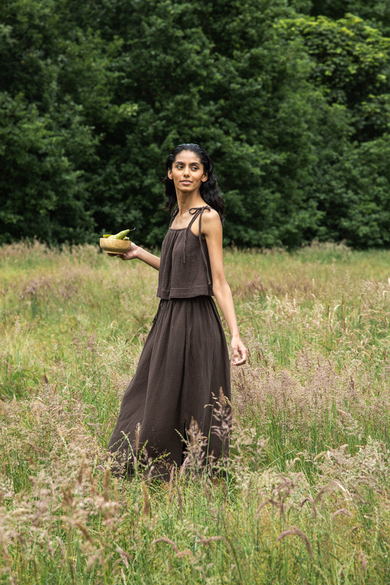 The Macy skirt is a relaxed, A-line fit that sits just above ankle length, featuring a narrow elasticated drawstring waistband, and side pockets.