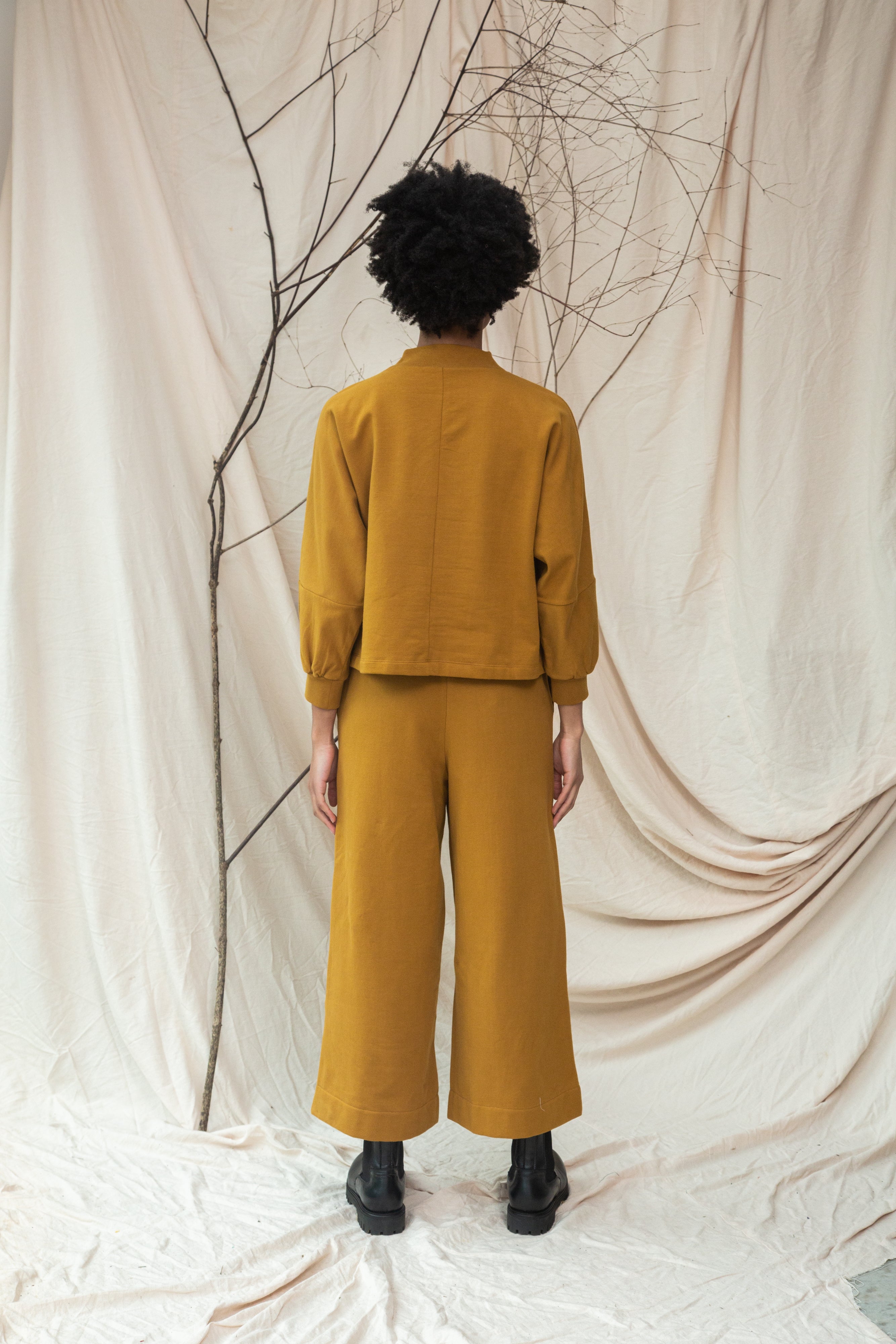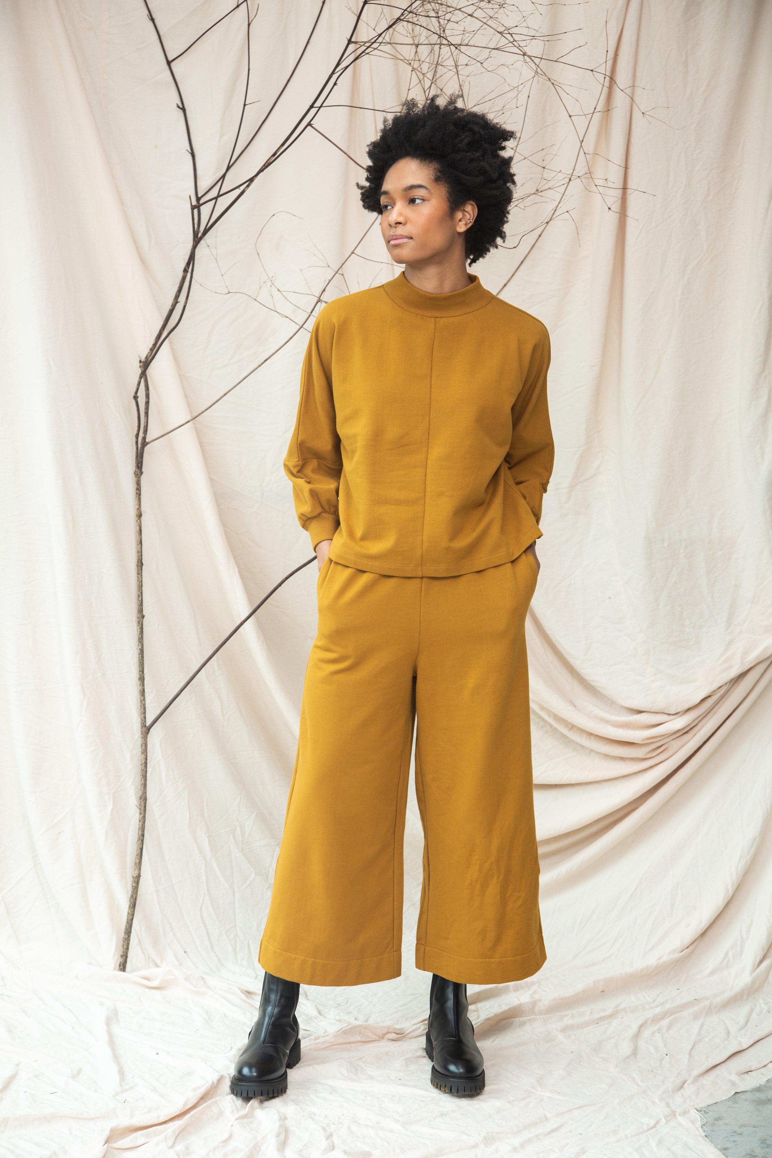 The Maiya is a high neck sweatshirt style with a centre seam detail and slightly cropped cuffed sleeve.