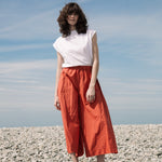 The Mazu Trousers are a super wide fit culotte style with side pockets and an elasticated waistband.