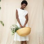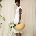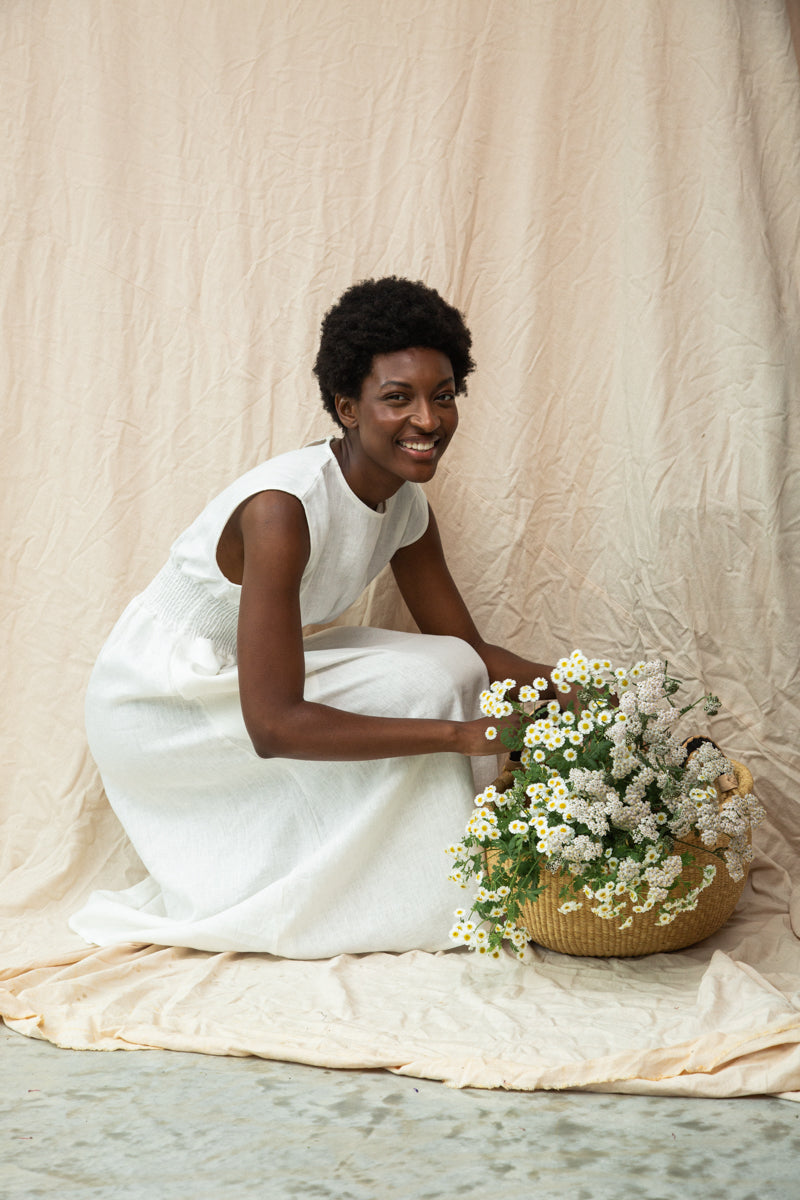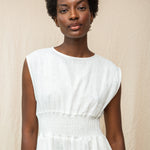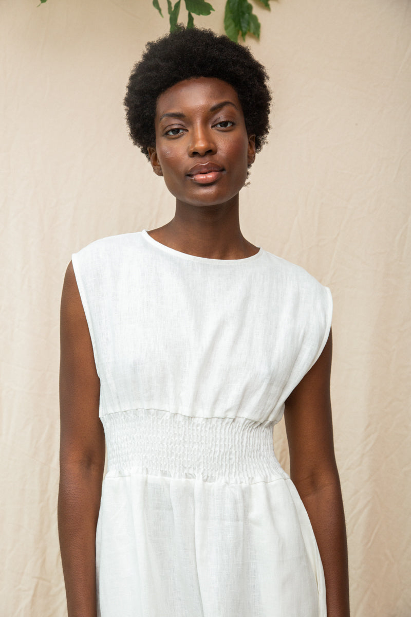 Crafted from our luxurious linen, the Ottillie-May features boxy, sleeveless top which blouses into a shirred waistband, with an A-line skirt and pockets at side seam.
