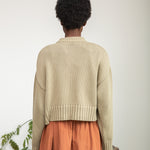 The Sugi is a cropped boxy cardigan with a button down placket and rib knit detail to the collar, cuffs and hem.