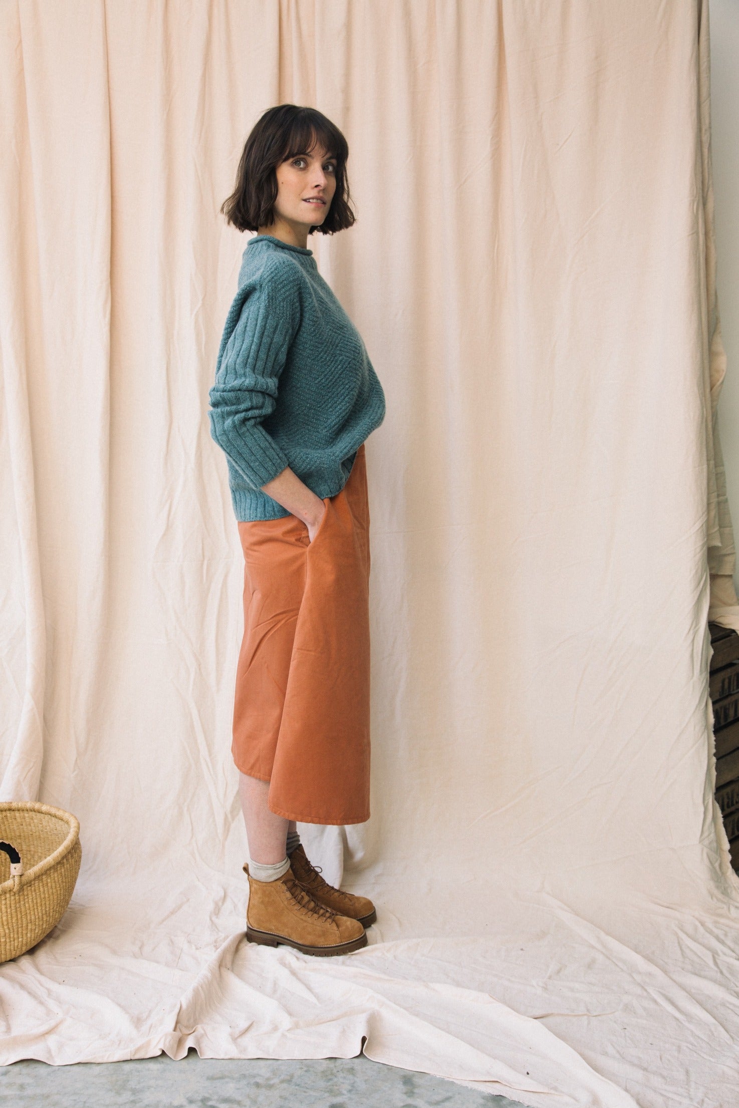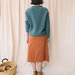 The Wisteria skirt is an A line style with a faux wrapover detail at the front, comfortable elasticated waistband, and side pockets.